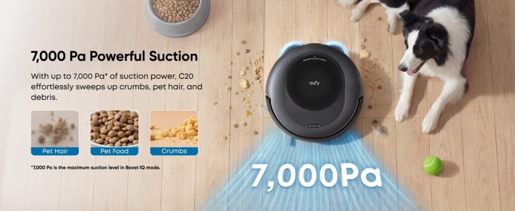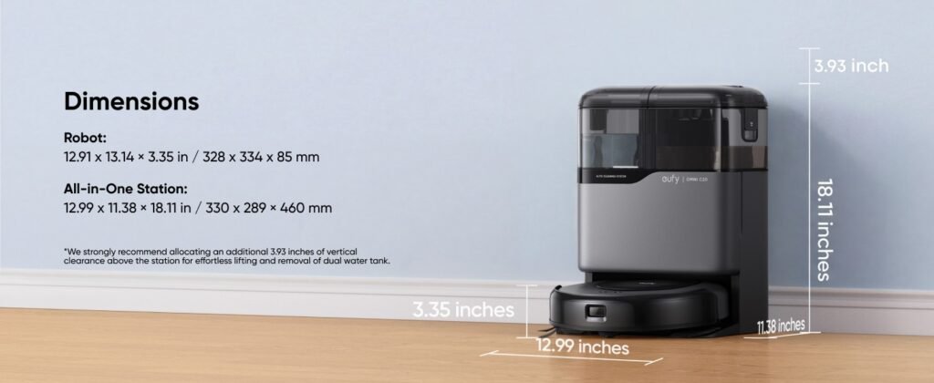 Most people judge a robot vacuum from eye level. They think in terms of obstacle avoidance demos, app screenshots, and suction numbers. The C20 makes more sense from floor level. Under the bed. Under the sofa lip. Beneath the edge of kitchen cabinets. Those are the places where dust turns into neglect because normal cleaning gets delayed until it becomes a chore worth resenting. eufy’s official specs lean hard into that same idea: a 3.35-inch chassis, 7,000 Pa suction, a reverse-rotating brush with Pro-Detangle Comb, dual mop modules, and an all-in-one station that empties, washes, dries, and refills.