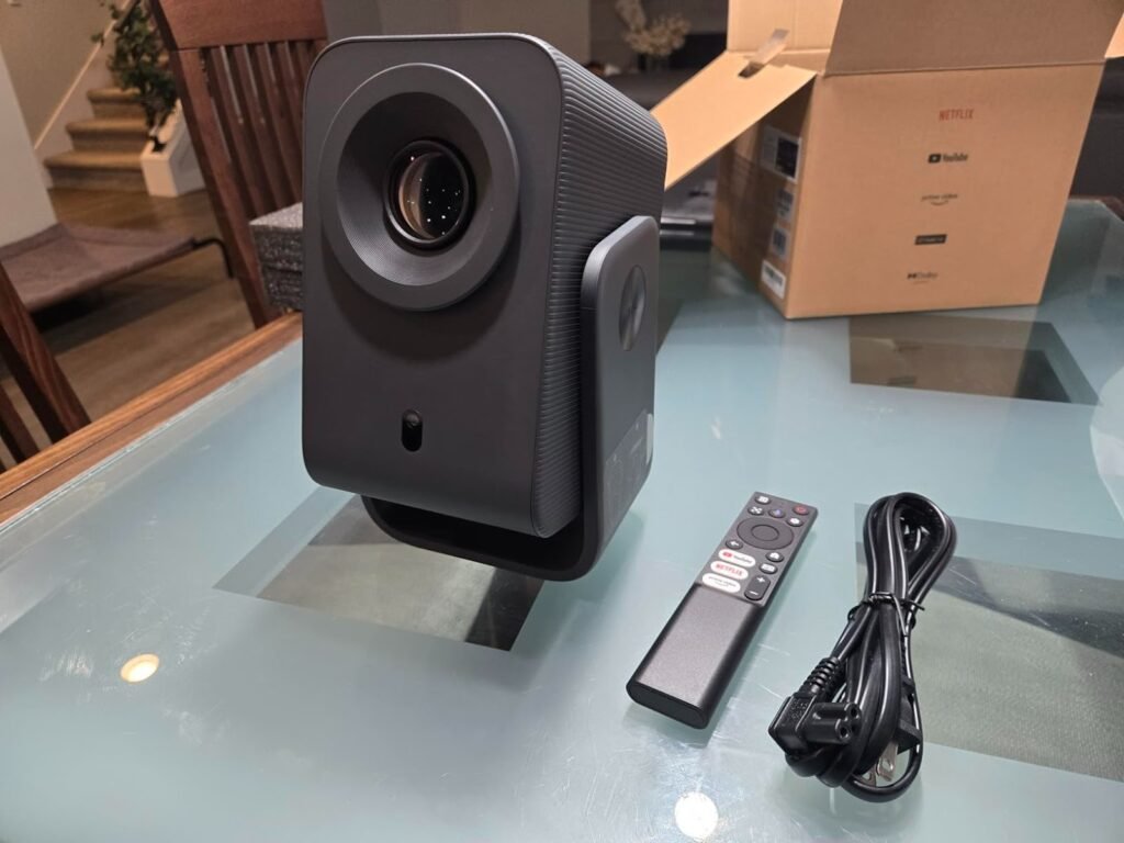 At roughly 5.5 pounds with a built-in handle/stand, Google TV, licensed Netflix on its product pages, Chromecast, auto focus, auto keystone, 1080p resolution, and dual 8W speakers, it solves a very specific kind of fatigue: the fatigue of turning movie night into a hardware project. It removes boxes. It removes cables. It removes the stupid little setup tax that makes people stop using half the gadgets they buy.